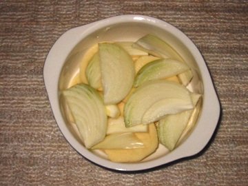 ジャガイモとタマネギの上にベーコンをお好みの量をのせ、ヨシダソースBBQを適量(個人的には多目がいいです。少ないとジャガイモまで味が回らないようです。というか、回ってなかった(笑))かけてください。